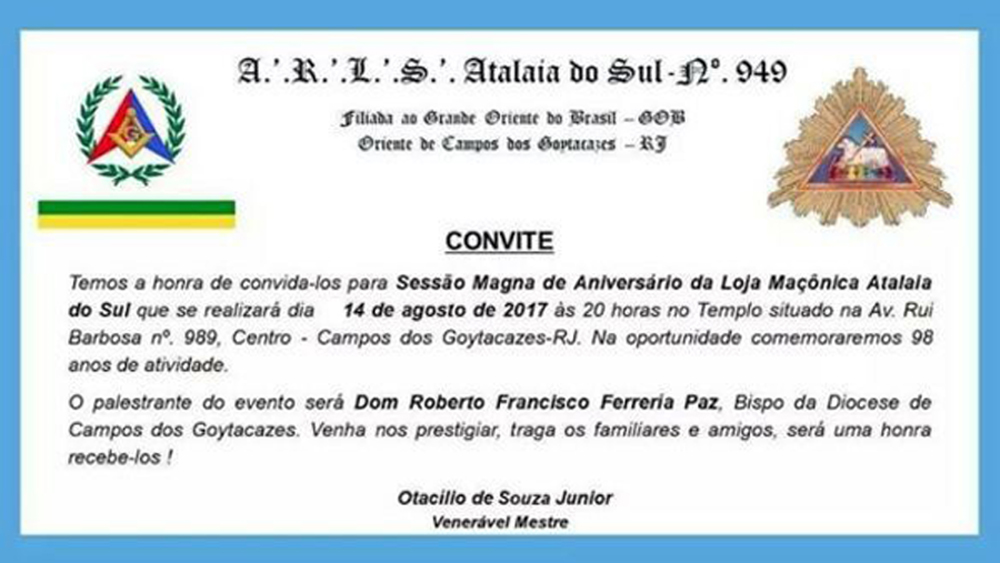 A Loja da Atalaia do Sul, na cidade de Campos, no Estado do Rio de Janeiro, convidou o Bispo Diocesano Roberto Paz para fazer um discurso no próximo dia 14 de Agosto de 2017, dia que comemora o 98º aniversário dessa organização Maçônica.